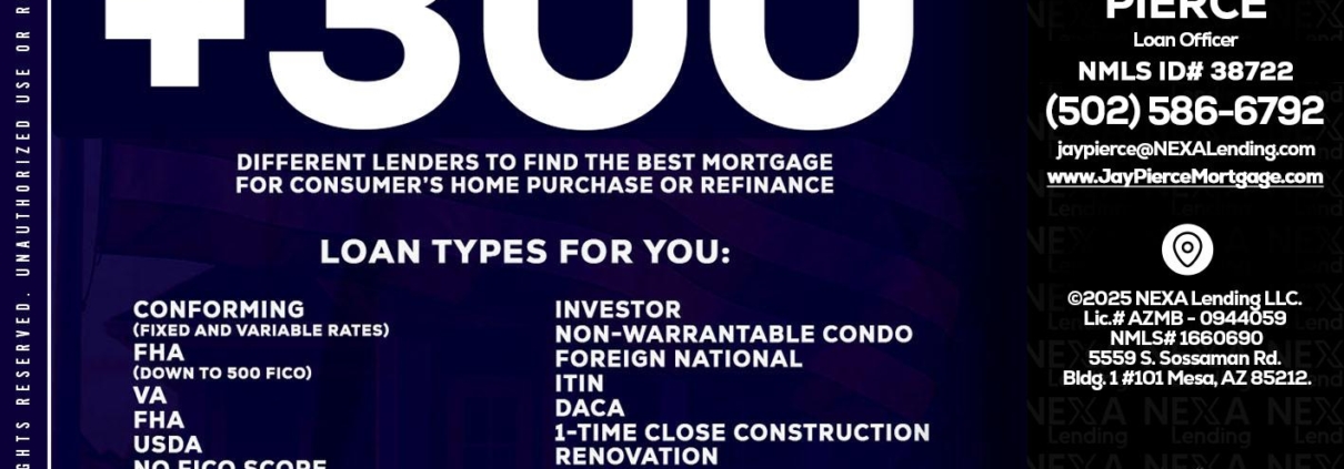 Hi, my name is Jay Pierce. I’m a Loan Officer with NEXA Lending LLC., offering personalized mortgage solutions, fast customized quotes, great rates and service with integrity.