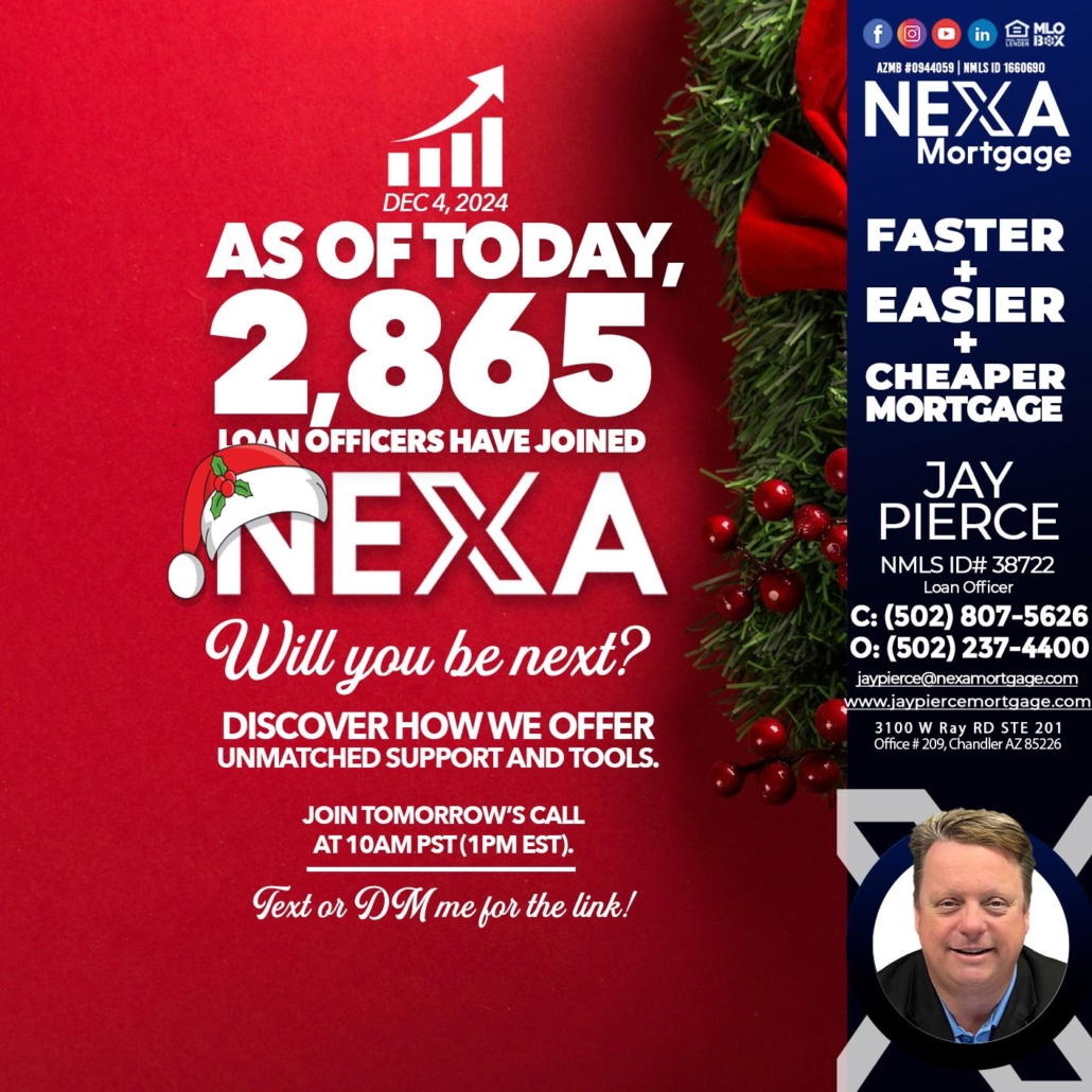 Hi, my name is Jay Pierce. I’m a Loan Officer with NEXA Mortgage LLC., offering personalized mortgage solutions, fast customized quotes, great rates and service with integrity.