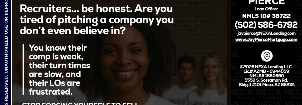 Hi, my name is Jay Pierce. I’m a Loan Officer with NEXA Mortgage LLC., offering personalized mortgage solutions, fast customized quotes, great rates and service with integrity.