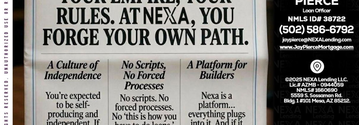 Hi, my name is Jay Pierce. I’m a Loan Officer with NEXA Lending LLC., offering personalized mortgage solutions, fast customized quotes, great rates and service with integrity.