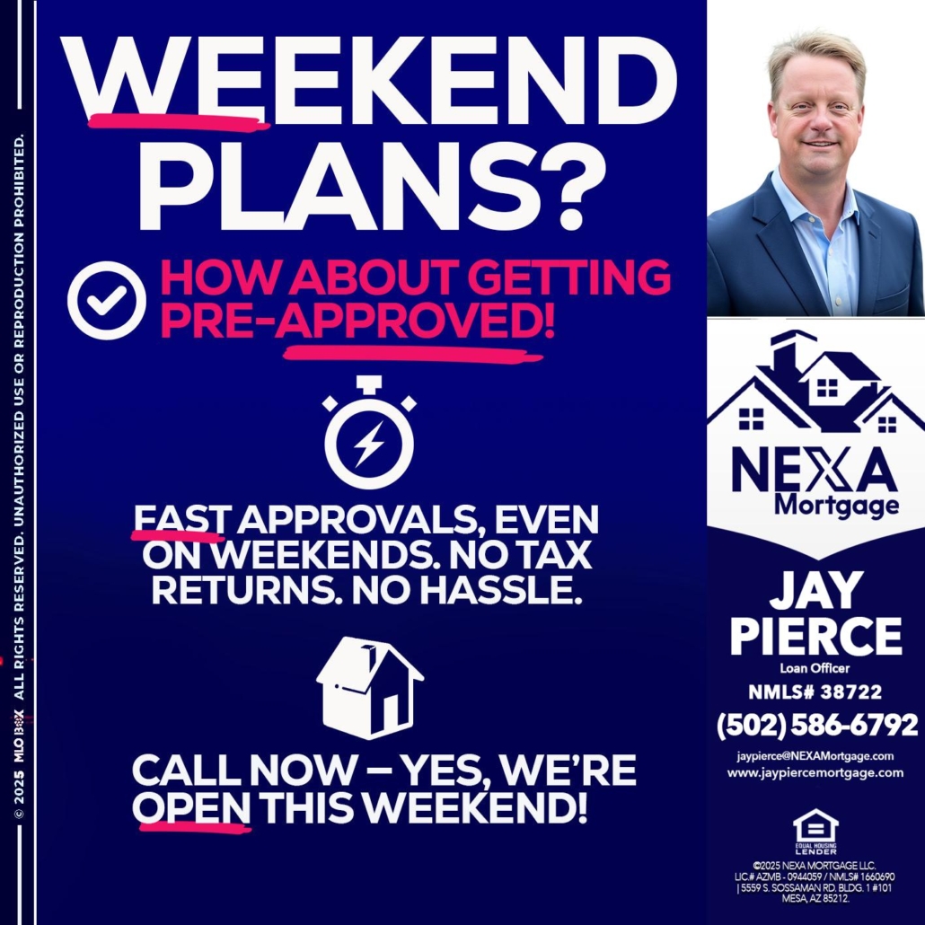 Hi, my name is Jay Pierce. I’m a Loan Officer with NEXA Mortgage LLC., offering personalized mortgage solutions, fast customized quotes, great rates and service with integrity.